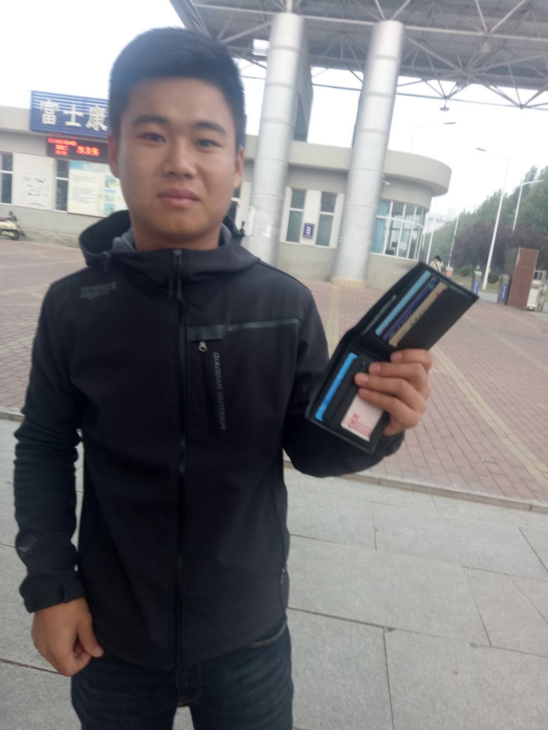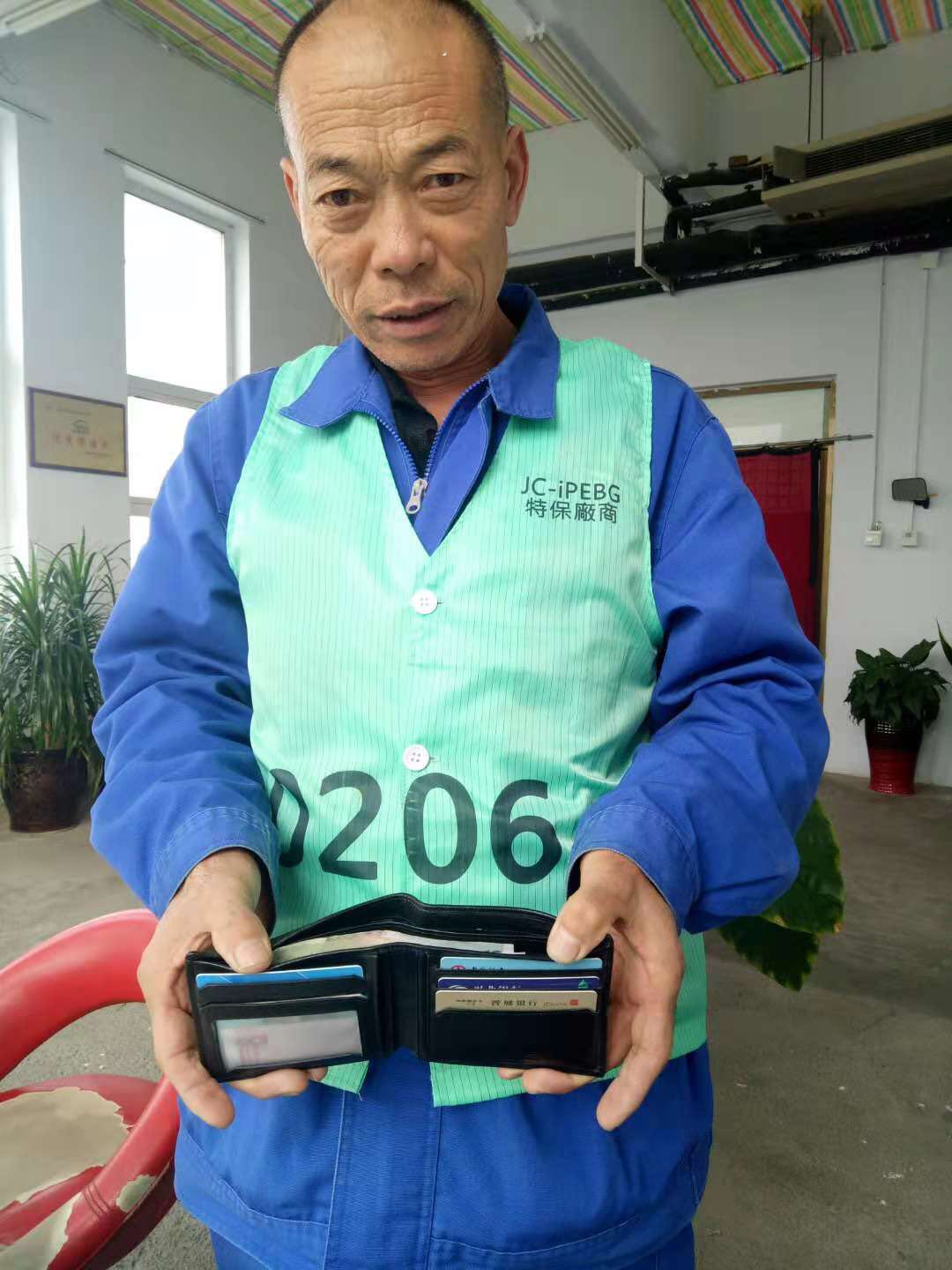 2018年10月16日,我公司員工賈聯化在富士康清潔時發(fā)現一個男士錢包,里面有加油卡、銀行卡以及一些現金,賈師傅連忙通知了部門主管,請她幫忙聯系失主。