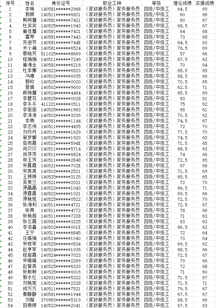 晉城市潔霸清潔服務(wù)股份有限公司職業(yè)技能等級認(rèn)定中心2024年1月27日上午第5批家政服務(wù)員中級認(rèn)定人員成績公示