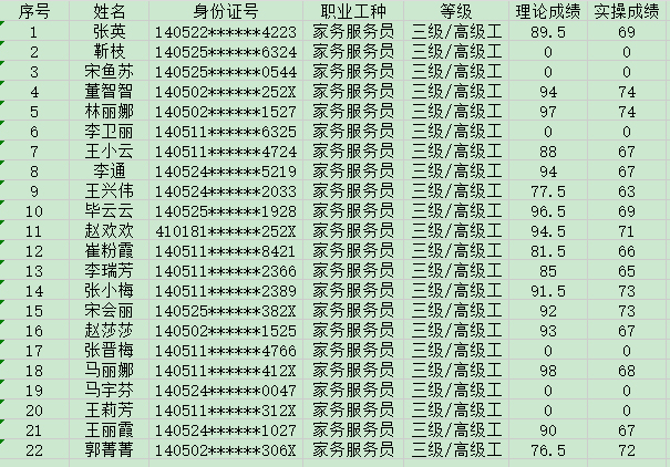 晉城市潔霸清潔服務(wù)股份有限公司職業(yè)技能等級認(rèn)定中心現(xiàn)將2024年4月28日認(rèn)定人員成績公示如下: