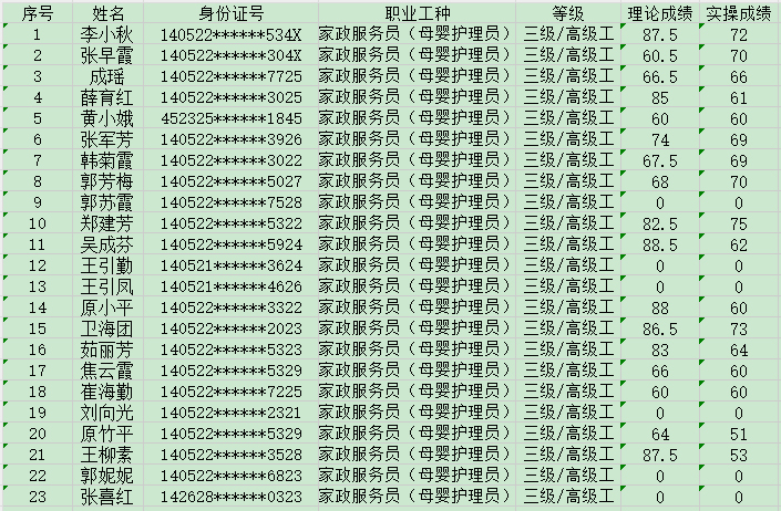 2024年5月20日上午第13批家政服務(wù)員高級認(rèn)定人員成績公示