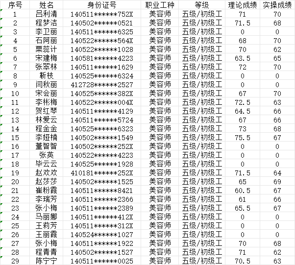 晉城市潔霸清潔服務(wù)股份有限公司職業(yè)技能等級(jí)認(rèn)定中心2024年9月21日第9批美容師初級(jí)認(rèn)定人員成績(jī)公示